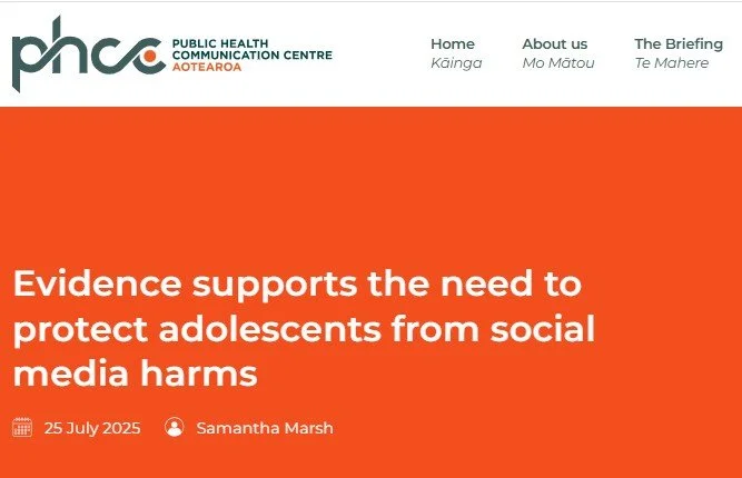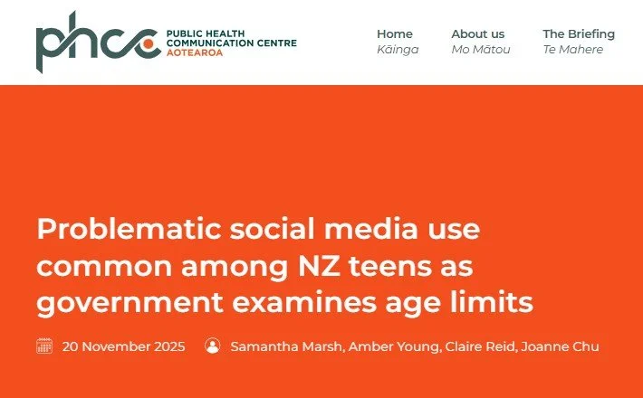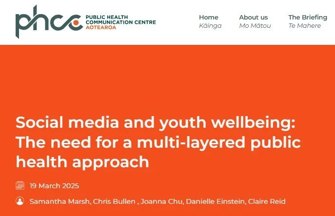 Cullen, J., Muntz, A., Marsh, S., Simmonds, L., Mayes, J., O’Neill, K., & Duncan, S. Impact of digital technologies on health and wellbeing of children and adolescents: A narrative review. New Zealand Journal of Physiotherapy. 2024 52(1), 62–77. https://doi.org/10.15619/nzjp.v52i1.364